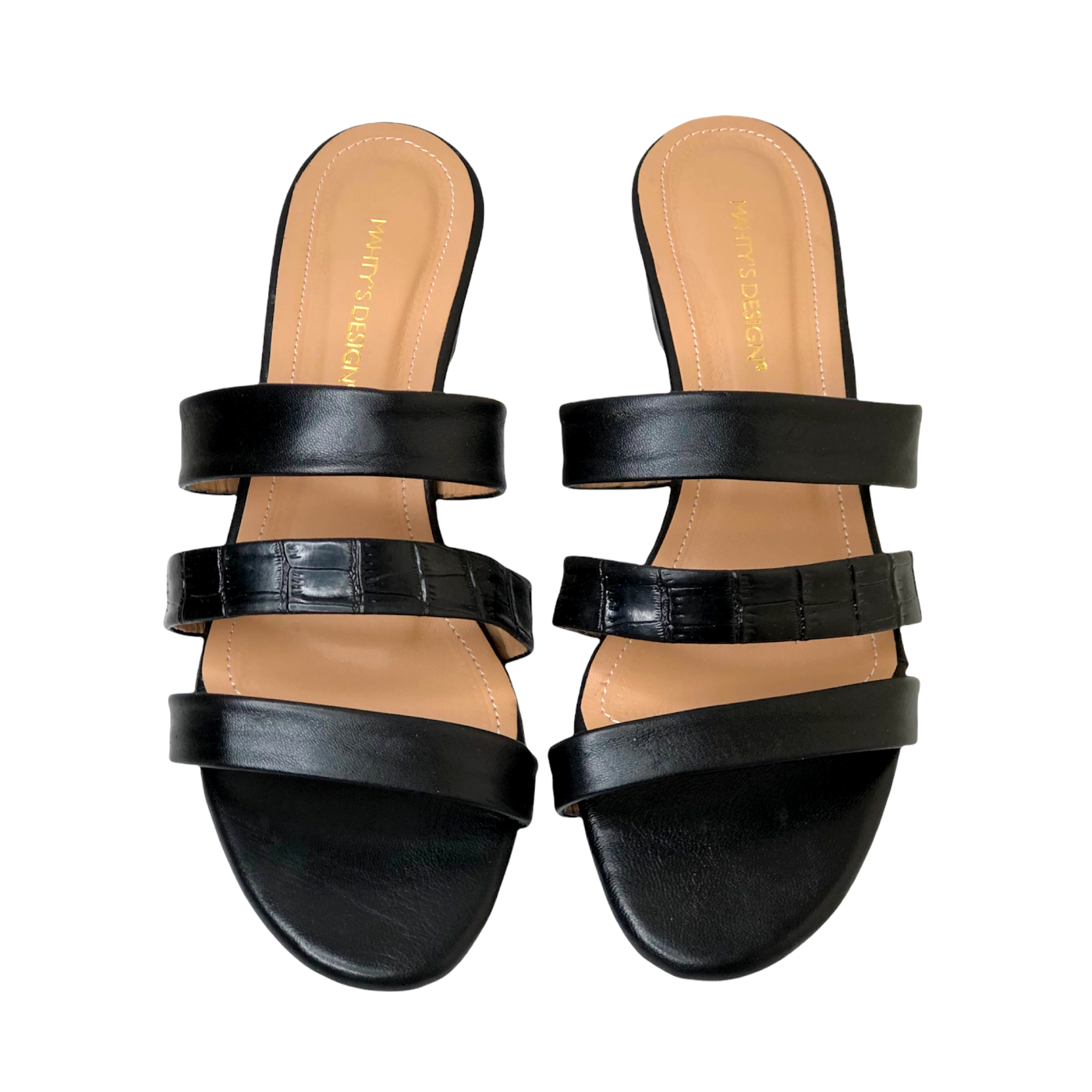 LINA Mules en cuir tendance et branché. Elle est Confectionnée en cuir noir, d’un talon carré et est constituée de 3 brides. Cette magnifique paire de mules est confortable et stylé et s’accorde parfaitement à différents looks. Le détail du cuir imprimé du milieu lui apporte une touche d’originalité.