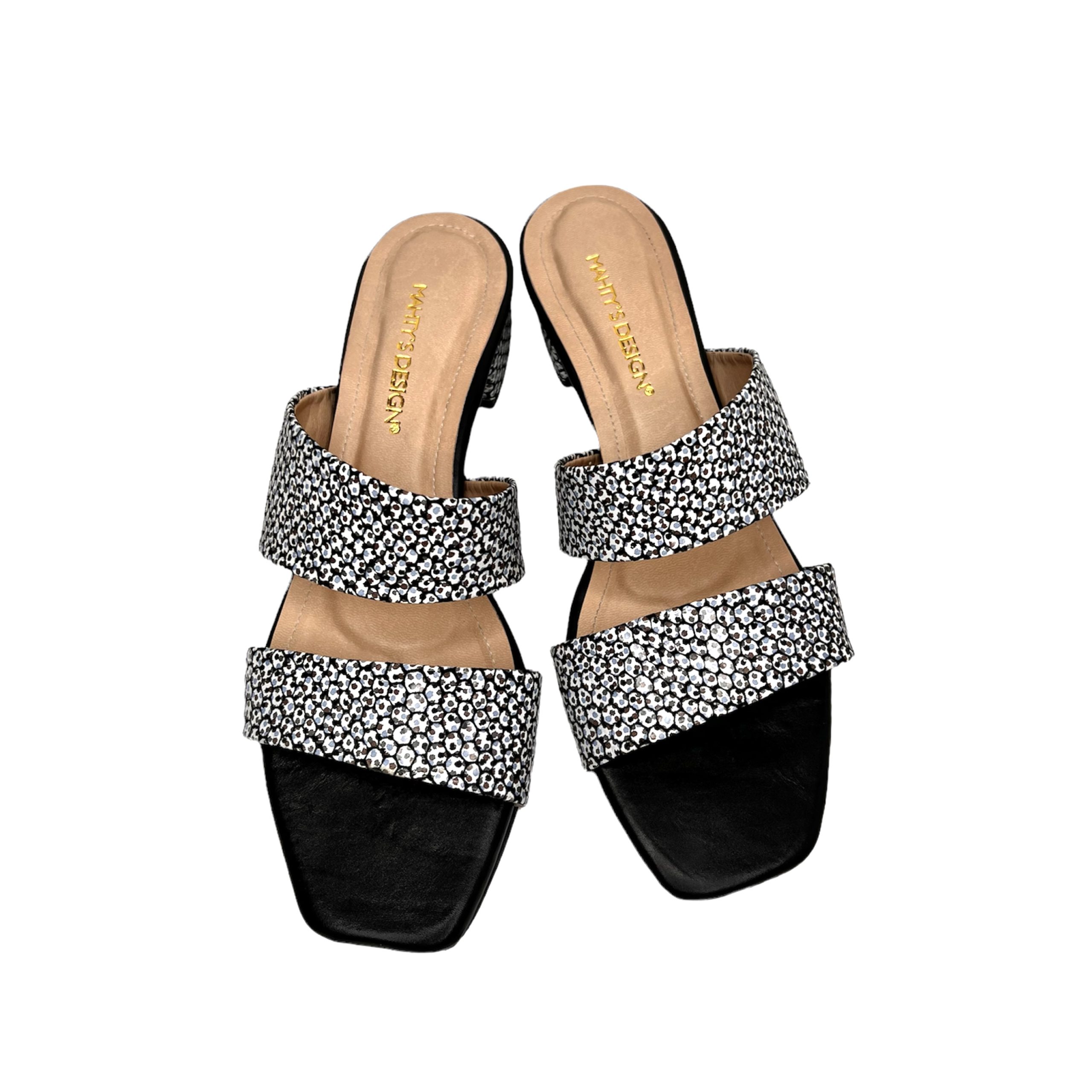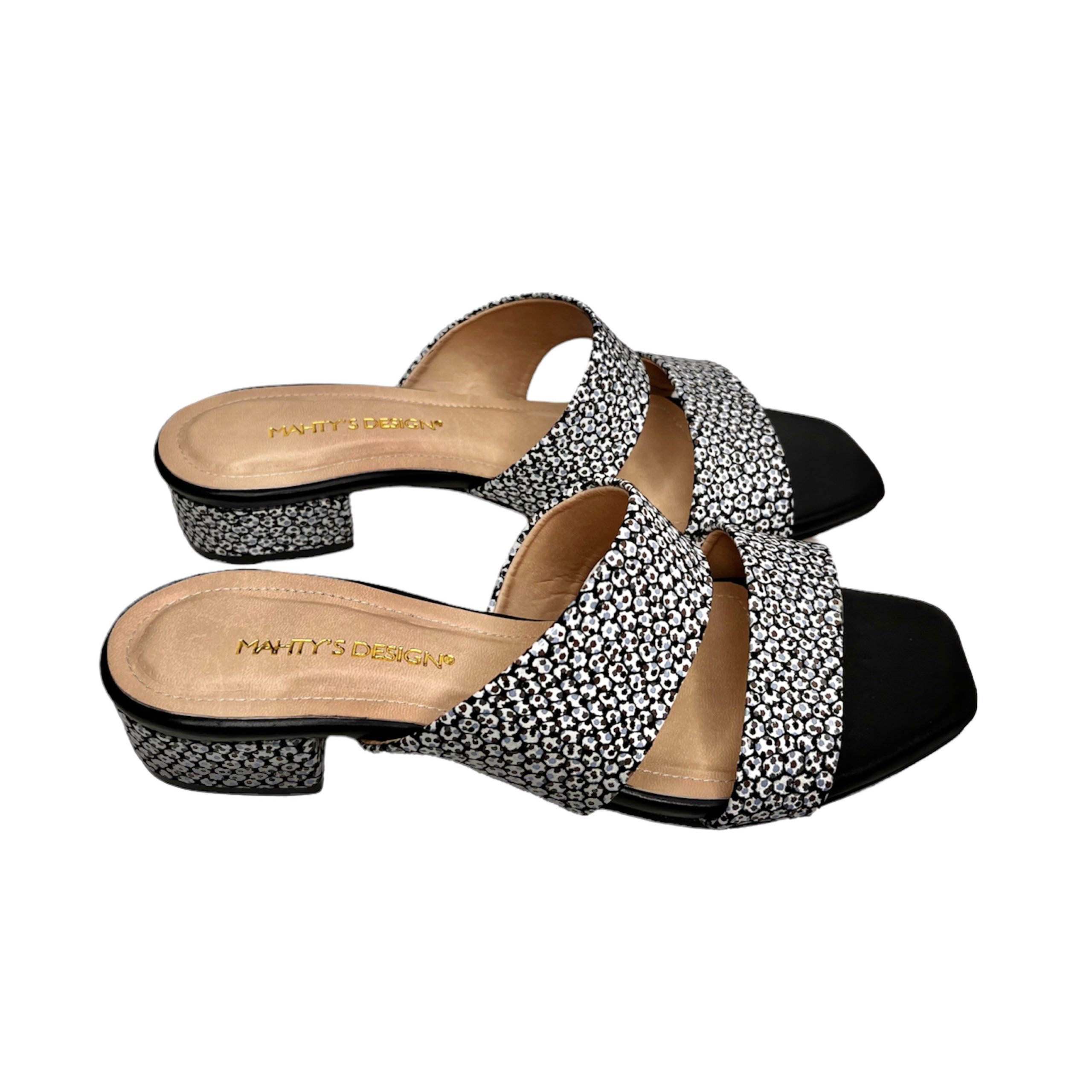RAISSA Mules tendances et originales. Elle est dotée de deux bandes asymétriques en cuir à motifs noir et blanc qui font toute son originalité et d’un talon carré très confortable. Cette magnifique paire de mules s’accorde à différents looks en jean ou robe pour un style trendy chic.